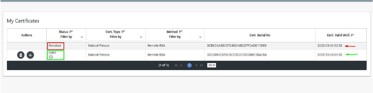 Στο status μπορείτε να δείτε αν υπάρχει valid certificate και την ημερομηνία λήξης. Αν το πιστοποιητικό έχει λήξη θα πάρετε email από την JCC ένα(1) μήνα πριν από την ημερομηνία λήξης όπου θα σας ενημερώνει σχετικά με την ανανέωση του πιστοποιητικού. Η ανανέωση μπορεί να γίνει εντός των τελευταίων εφτά(7) ημερών πριν από την λήξη.