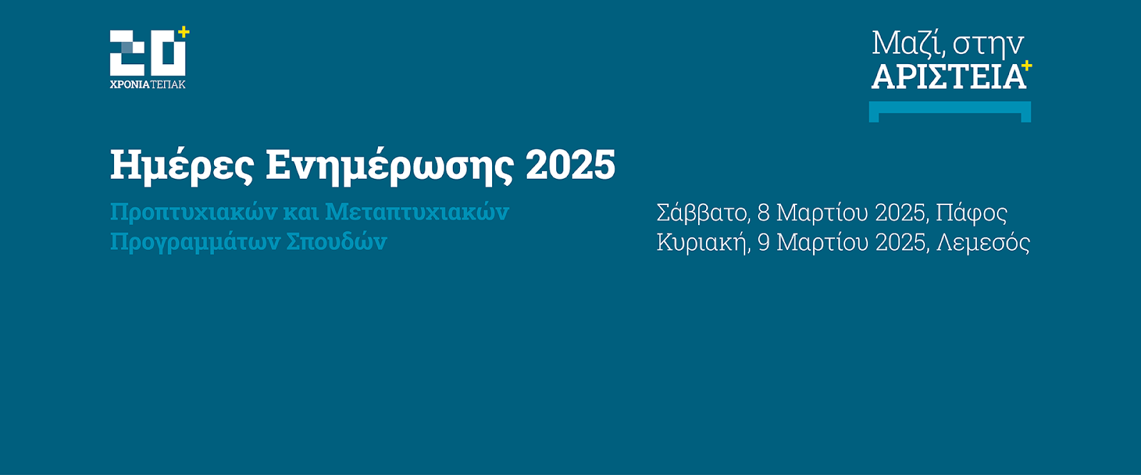 Το Τεχνολογικό Πανεπιστήμιο Κύπρου (ΤΕΠΑΚ), στο πλαίσιο ενημέρωσης των υποψηφίων προπτυχιακών και μεταπτυχιακών φοιτητών/τριών για τα προγράμματα σπουδών και τις παρεχόμενες υπηρεσίες, διοργανώνει «Ημέρες Ενημέρωσης» στις κτηριακές εγκαταστάσεις του στην Πάφο και στη Λεμεσό, στις 8 και 9 Μαρτίου 2025, αντίστοιχα.