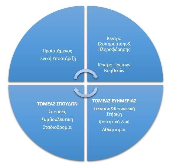 Η Υπηρεσία είναι διαρθρωμένη σε δύο Τομείς: στις Σπουδές και στην Ευημερία Φοιτητών.