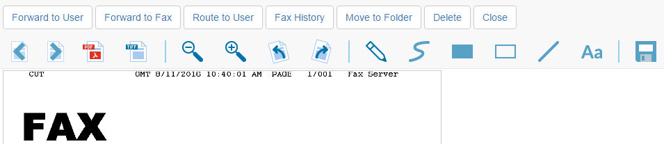 10. Επιλέγοντας με διπλό κλικ του ποντικιού κάποιο από τα τηλεομοιότυπα που σας έχουν σταλεί, εμφανίζεται το παράθυρο διαχείρισης τηλεομοιοτύπων. Από εδώ, μπορείτε να προωθήσετε το αρχείο είτε σε κάποιον άλλο χρήστη της υπηρεσίας Right Fax επιλέγοντας “Forward to User” είτε σε κάποιο άλλο τηλεομοιότυπο επιλέγοντας “Forward to Fax”. Έχετε επίσης την επιλογή να σώσετε το αρχείο είτε ως .pdf είτε ως αρχείο εικόνας .tiff επιλέγοντας τα αντίστοιχα εικονίδια. Μπορείτε επίσης να περιστρέψετε το αρχείο ή να προσθέσετε σημειώσεις σε αυτό χρησιμοποιώντας τα πιο κάτω εικονίδια.